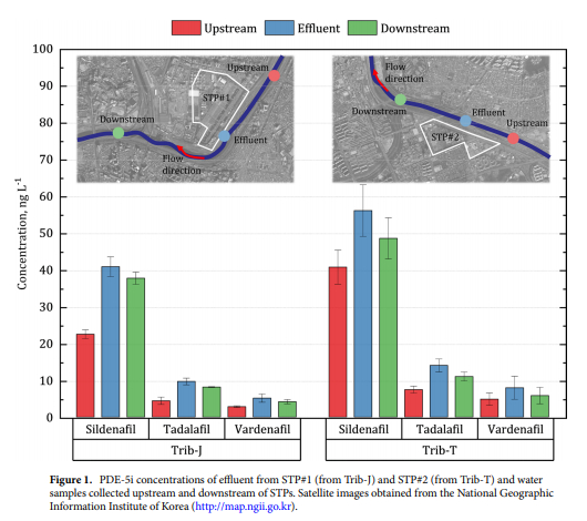这篇文章中表明在排污水中发现了磷酸二酯酶-5抑制剂(简称PDE5),并且含量超标的PDE-5被排入了韩国的“母亲河”也就是汉江。PDE5对人体的主要作用为:“治疗男性勃起功能障碍” 也就是我们所常说的伟哥,代表性药物比如西地那非、 伐地那非、 他达那非都在排入汉江的废水中检测出来了,并且含量严重超标。