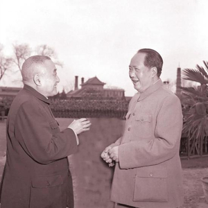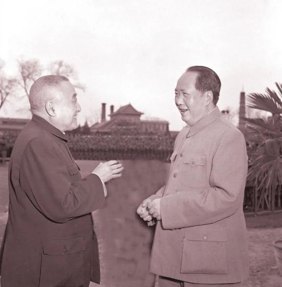 ▲ 1957年,毛泽东与黄炎培亲切交谈。