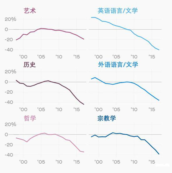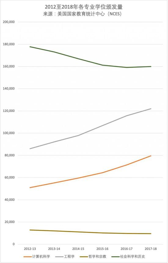 反观文科,自 2012 年起,高校每年都在流失大量文科生。哲学与宗教学科的学位颁发量从 2012 年的 1.2 万多下跌至 9603。即使是稍稍热门一些的社会学,2018 年的毕业生与 6 年前比也少了 2 万多人。