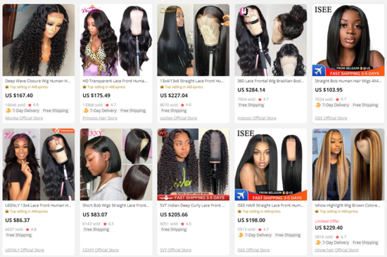 点进“瑞贝卡”的官网,一眼望去都是黑人模特,假发款式也都主打欧美网红款。海外版淘宝“速卖通”上也是相同的景象。那些销量几千上万的假发,评价区里po出买家秀的,清一色都是黑人小姐姐。