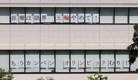 东京立川相互医院三楼的窗户上贴着反对奥运的标语:“医疗系统到达极限,停办奥运会!放过大家,没法举行奥运会!”