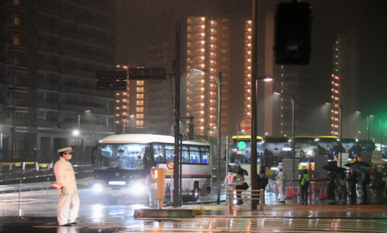 当地时间6月20日凌晨,主办方进行了从奥运村到主会场的巴士送迎及交通管制彩排。