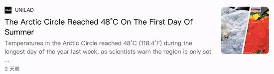 更令人惊讶的是,在人口没有那么密集的极高纬度北极地区,最近几天的温度值居然丝毫不比我们低维度的地区温度低,在北极圈内俄罗斯的Verkhojansk小镇,当地居民记录到了48°C的地表最高温度值!!