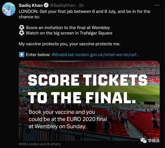 为了让伦敦年轻人踊跃接种新冠疫苗, 今早,伦敦市长萨迪克·汗在推特上正式 发起了“打疫苗就有机会赢得欧洲杯决赛门票”的抽奖 活动。