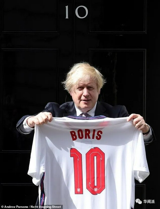 昨天,首相约翰逊在唐宁街10号前,向媒体展示了印有自己名字的英格兰队10号球衣,以示对球队的支持。