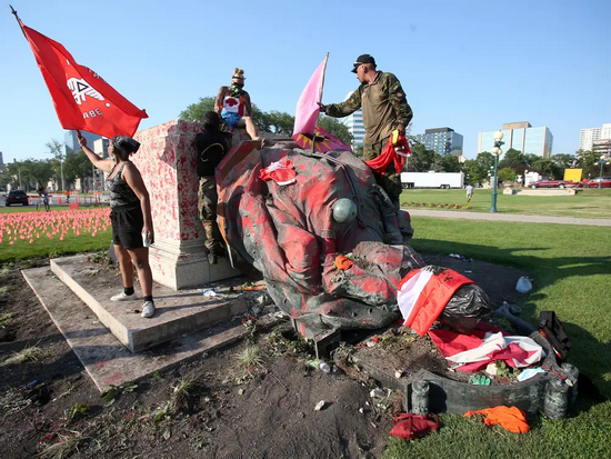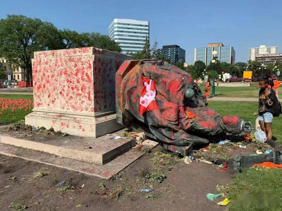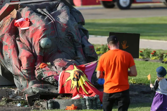 加拿大人愤怒地泼洒上红色的油漆,在雕像的底座按满了血红的手印,人们还爬到了雕像的身体上拍照,踩在女王的头颅上表达自己的愤怒。