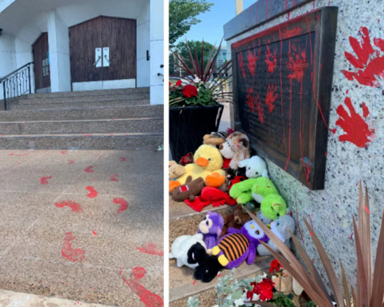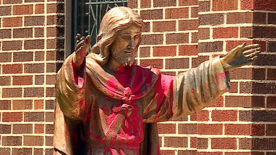 一些天主教堂的耶稣像被泼洒上红漆,写上了215的数字……