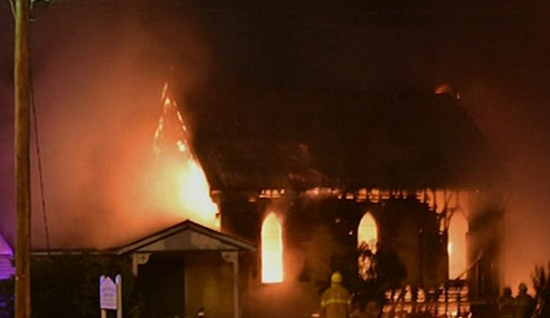 凌晨1点,一名骑警发现当地圣心教堂燃起了熊熊烈火。两个小时后,25英里外的圣格列高利也发生了火灾。