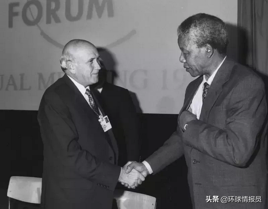 ▲南非最后一位白人总统弗雷德里克。威廉。德克勒克与纳尔逊。曼德拉握手