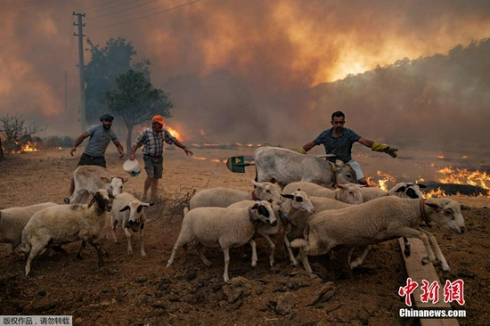 近日,土耳其南部海岸山火持续肆虐,土耳其总统府新闻办公室主任法赫尔丁·阿尔通8月2日通过社交媒体表示,土耳其已发动一切力量,与森林大火进行斗争。消防人员已连续多日努力控制这场在沿海度假城镇肆虐的大火,自火灾发生以来,数千人已经从家中撤离。图为受山火影响,民众赶牲畜逃离。(中新网资料图)