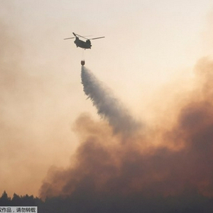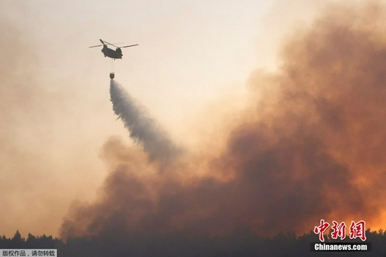 8月4日,希腊雅典北部Varympompi郊区野火继续肆虐。图为一架直升飞机洒水灭火。(中新网资料图)