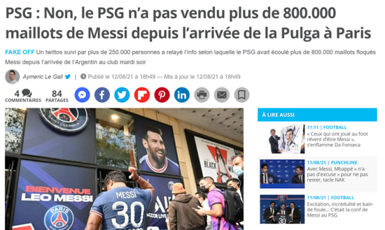 ▲ 近日,网上有报道称梅西球衣一天就卖出80万件,让大巴黎狂赚3000万欧,12日,法媒辟谣,说这一数据并未得到官方证实。(推特截图)