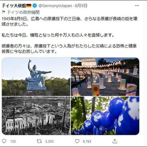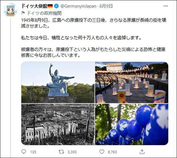 德国驻日本大使馆在推特上发文悼念原子弹爆炸中的受害者,不料却引发许多日本人的不满和抨击。