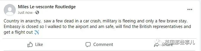 大使馆关闭了,所以我走到了机场,这里很安全,我会找到英国代表,然后乘飞机离开的。”
