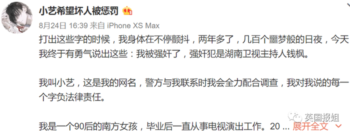 本周著名主持人钱枫被化名为“小艺”的女生指控,又引发了一波社会激烈的讨论。