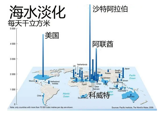 此外,沙特还转向另一个取水途径:海水淡化。海水淡化是水来源最为丰富且持续的方式。目前,沙特的海水淡化规模世界第一,仅在2011年就有27座海水淡化工厂,日产淡水可达330万立方米,但海水淡化不仅成本高昂,而且还需要巨大的能源,沙特石油天然气产量的25%用于海水淡化事业,预期到2030年,沙特石油和天然气产量的50%将用于海水淡化。