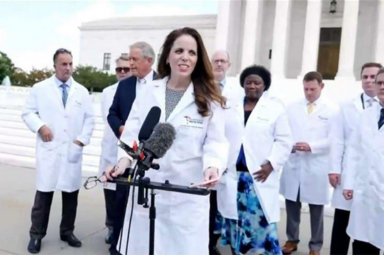 几天后,保守派发表了一份声明,称疫情是大规模伤亡事件,其中就有Simone Gold的签名,她那时还是一名律师,在加州一家医院做兼职承包商。10周后,作为“美国前线医生”组织的创始人,Gold和一群身穿白大褂的“医生”,站在美国最高法院的门口前,大谈“防疫措施会破坏美国的宪法”,还把防疫和宗教混为一谈。虽然现场没几个人参加,但是“美国前线医生”们确实卖力气表演。