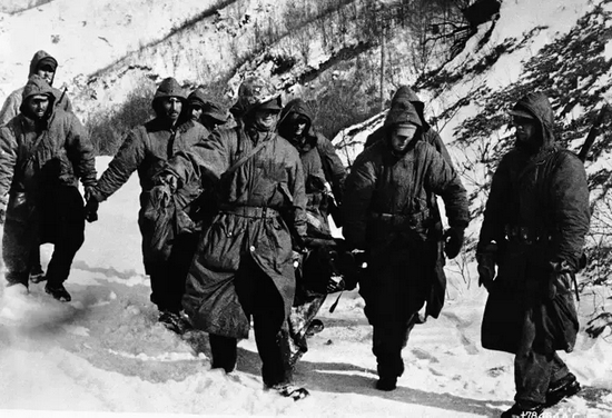 “向另一个方向前进”的过程也是艰难的。尽管海军陆战队在人数、装备上都占优势,还有空中掩护,但中国军队只在夜晚进攻,一到白天,他们便都撤回山上躲避炸弹。美军被困在长津湖所在的山谷里,没有地形优势的他们只能被动防守。