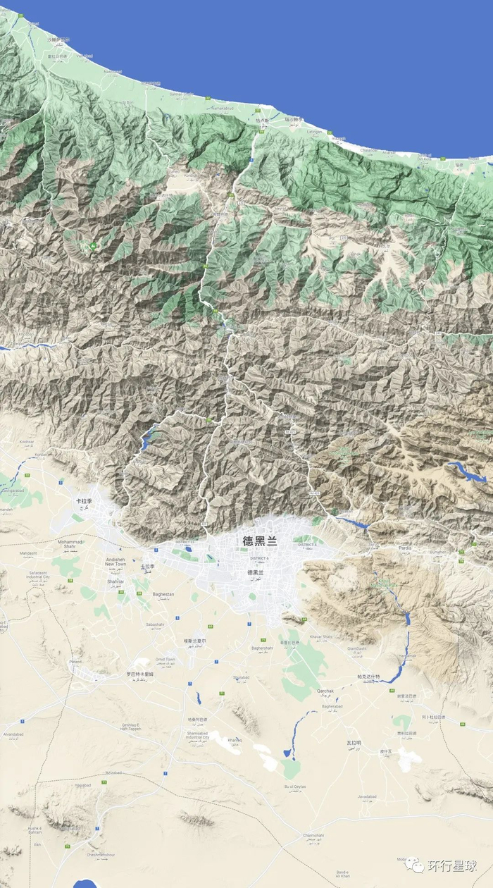 在伊朗这个整体偏干旱的国家,水是至关重要的(在波斯语里,“蓝色”直译就是“水色”,对水的重视也能从伊朗传统建筑中大量使用蓝色的釉中看出)。春冬两季山北边里海飘来的水汽遇到厄尔布尔士的阻挡,化成雨雪落在山中,而到了夏天,山顶的雪水融化后继续滋养山脉的两侧。因为这个原因,伊朗的大城市大多数选址在厄尔布尔士和札格罗斯山脉的两侧,方便获取宝贵的水资源。
