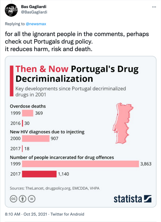 “给评论里的所有无知者,看看葡萄牙的毒品政策。注射中心减少伤害,风险和死亡。”