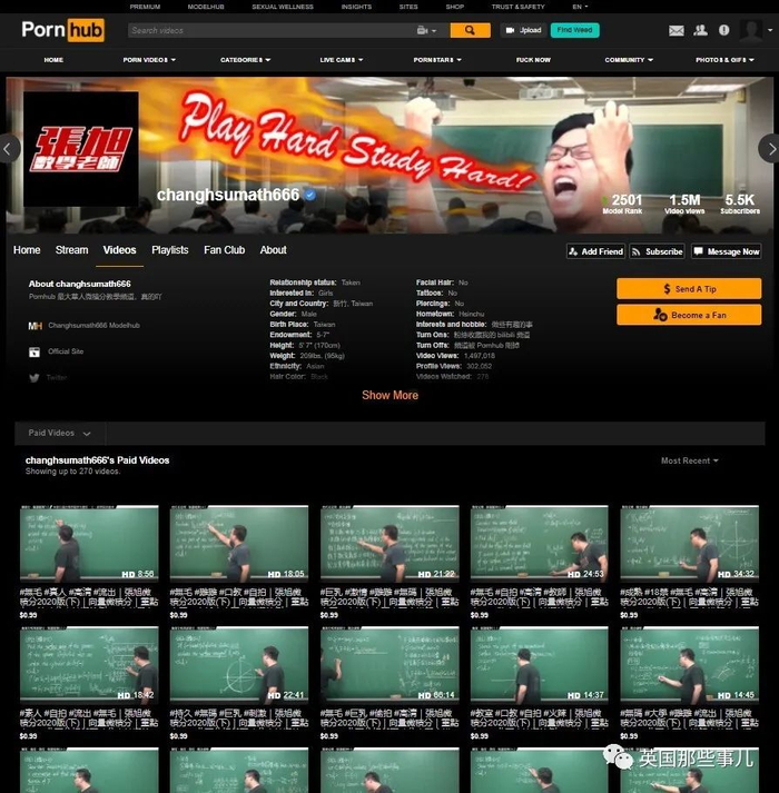 “很多想要学数学的学生,都是通过Pornhub认识我的,其中不少人买了我的网课。”