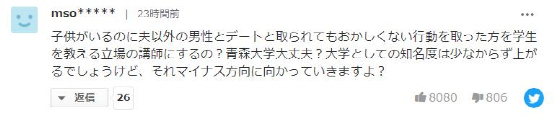 “即使被拍到有了孩子还和丈夫以外的男性约会,也要当作没事人一样教学生?青森大学没事吧?大学的知名度倒是会慢慢提升,但是会朝着反方向发展。”