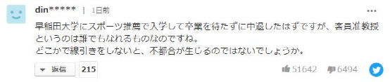 “靠体育推荐生的名额进了早稻田,结果没等毕业就中途退学,看来谁都能当客座副教授啊。如果不严格标准,就会产生不适合的问题吧?”