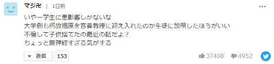 “真糟糕啊——只能给学生带来负面影响。校方最好跟学生说明白为什么要接受福原爱当客座副教授。出轨还不要孩子可是最近的新闻,这反应也太迟钝了。