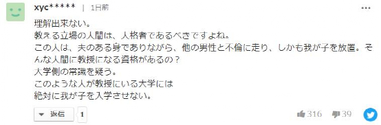 “无法理解。教书育人之人应该是人格高尚之人。福原爱有丈夫还出轨其他男性,而且还不管孩子,这种人有资格当教授?都怀疑校方有没有常识。我是绝对不会让自己的孩子去这种人任教授的大学上学。”
