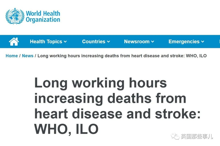 长时间工作有害身体健康。世界卫生组织和国际劳工组织今年5月发文说,每周工作超过55个小时,会导致得中风和致命心脏病的风险显著增加。