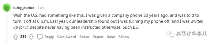 “我希望美国也有这个政策。20年前,公司给了我一部工作手机,说下午6点可以把它关掉。但去年,我的领导发现我把手机关了,我被记过了,哪怕之前没人叫我打开它。真是烂得要死。”