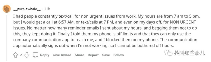 我和他们说过很多次了,求他们别在非工作时间联系我,但他们根本不管。最后我说我的手机关机了,想要找我只能通过公司的通讯APP,然后我在手机上把他们全部拉黑了。那个通讯APP在非工作时间会自动登出,我终于有了清净日子。”
