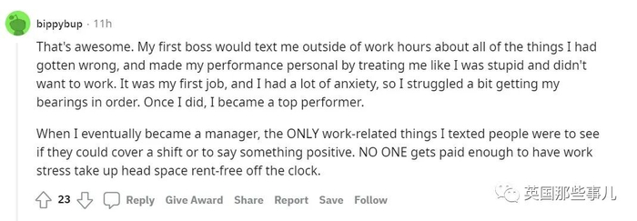 “这法律真棒。我的第一个老板经常在非工作时间给我发信息,指出我做的所有不对的事,还在公事上夹杂私人感情。
