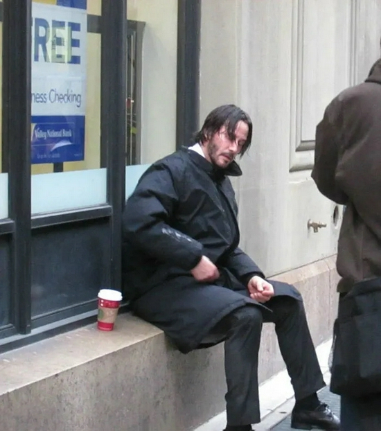 2003年,基努在巴黎的街头被拍到向一位无家可归的女人投硬币。他走到女人的身前,不是施舍的直接扔下,而是把腰弯得极低,将钱轻轻放进塑料杯。