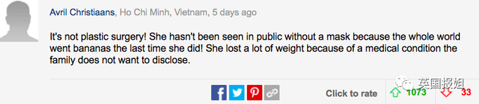 “不是整容!她戴口罩是因为上次没戴的时候全世界看到她的样子都疯了!她是因为一个不想透露的疾病才瘦了这么多的!”