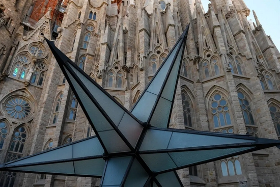 12月8日是天主教节日圣母无染原罪瞻礼,圣家堂圣母玛利亚塔楼上的十二角星首次亮灯,800扇玻璃窗和它一起照亮西班牙巴塞罗那的夜空。一周前,这颗重5.5吨的巨大星星正式为圣母玛利亚塔封顶。