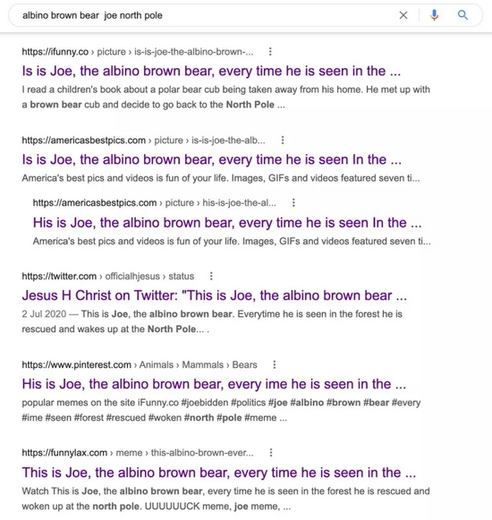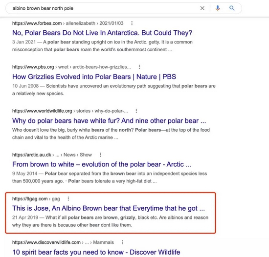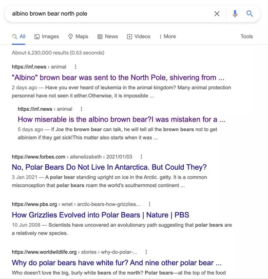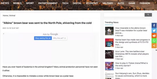 输入了几个关键词“白化病”(albino)、“棕熊”(brown bear)、“北极”(north pole),前两个就是相关新闻,而且出自同一网站。