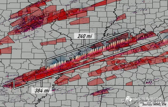 其中,在阿肯色州接地、横跨密苏里、田纳西和肯塔基的“四州龙卷”,在雷达监测上出现了连续不断的四个半小时强旋转特征,路径总长度达386公里,将沿途的至少23个城镇夷为平地。这些数据,已经完全超越美国二战前的龙卷之王--1925年的“三州龙卷”。