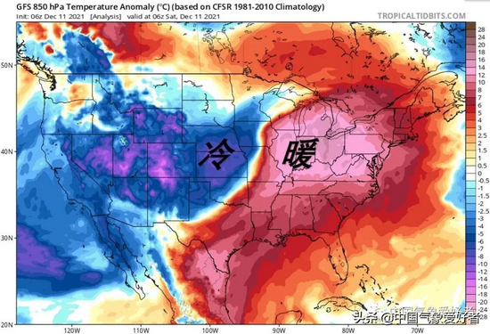 可以这么理解,虽然现在是12月,但美国东南部气温严重偏高,宛如暮夏或初秋;然而由于北极涡旋的活跃,代表冬天实力的冷空气在高空俯冲南下,扎进夏天--而这冬夏对峙,恰好又发生在美国中部大平原,龙卷风遂集体发生。