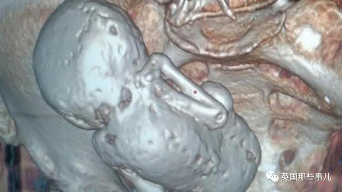 由于年代已久,婴儿已经“石化”,如同木乃伊一样待在妈妈的肚子里。。。。