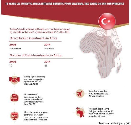 尽管在外交上高调示人,但土耳其在谋求对非洲贸易问题上要低调许多。土耳其与非洲国家间的伙伴关系始于2005年。很快,到2008年,亦即全球金融危机爆发之年,非洲国家联盟就宣布土耳其为其“战略伙伴”。紧接着就在伊斯坦布尔举行了首届土耳其-非洲国家伙伴关系峰会。此后,土耳其与非洲国家的关系开始了强劲发展态势,相互间的伙伴关系亦在2009年升级成为战略伙伴关系。到了2014年,在非洲国家赤道几内亚首都马拉博举行了第二届土耳其-非洲国家峰会。当然,土耳其对非洲的外交攻势,在最初几年里,主要聚焦的是世界其他地区不太关注的非洲穆斯林国家,如苏丹和索马里。比如当2011年埃尔多安访问摩加迪沙时,其是 20 年来首位到访的非非洲国家的元首。