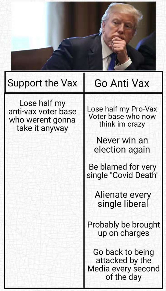 对于特朗普来说,最有利的局面恐怕是,会有更多粉丝响应号召接种疫苗,从而能活到为他投票的那一天。