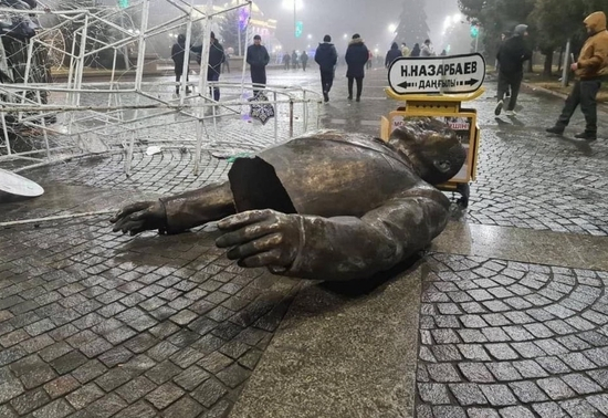 其他城市也出现类似情况。在阿拉木图东北的小城塔尔迪库尔干,一尊前总统纳扎尔巴耶夫的大型铜像被抗议者拉倒在地,断成两截。