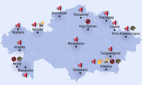 网上流传的抗议地图显示,许多城市都有抗议集会,但暴力和纵火事件主要集中在阿拉木图