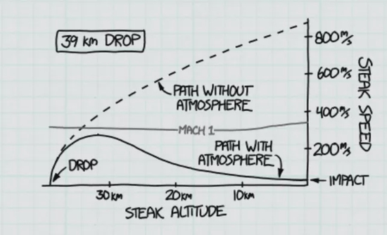 而烤牛排也差不多,甚至还有更为详细的研究。当从70km的高度落下时,牛排高速下落,将空气加热到177℃,但这个过程只有不到1分钟,所以没法烤熟牛排。