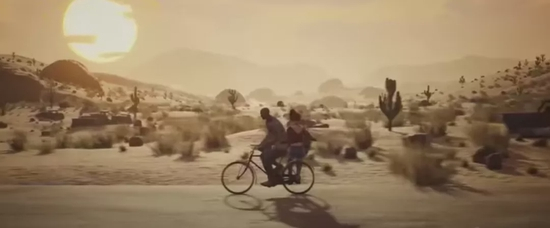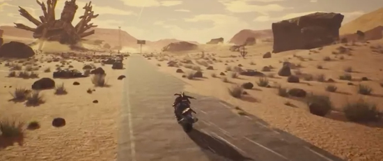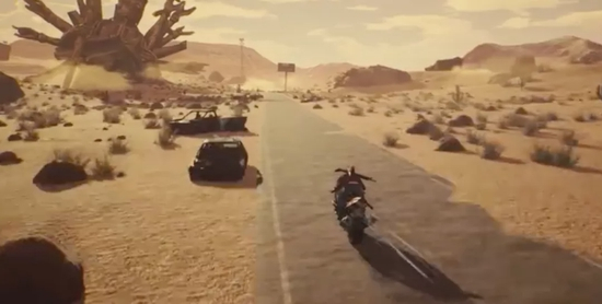 仔细看,路的两边散落着废弃的汽车骨架,这是一个典型的战后“废土世界”。