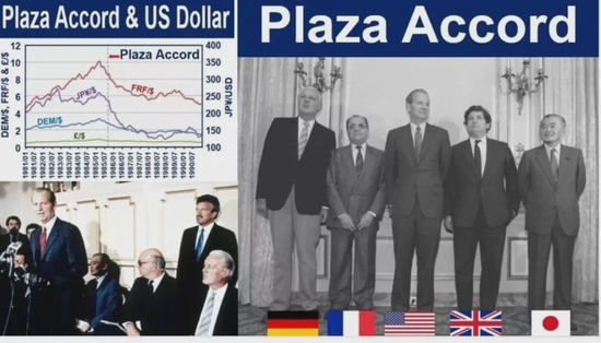 1985年9月22日,在美国极力鼓动下,英、法、美、日、西德五国签订了“广场协议”,决定美元对世界其他主要货币的比率在两年内贬值30%,以此逼迫日元升值。