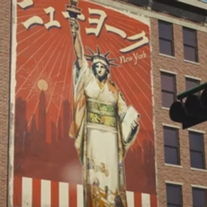 自由女神被裹上了和服,一轮红日从背后高楼上升起。