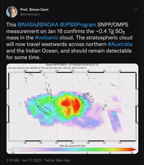 根据密歇根理工大学火山学家Simon Carn教授1月17日凌晨2点(格林威治时间)的推文——