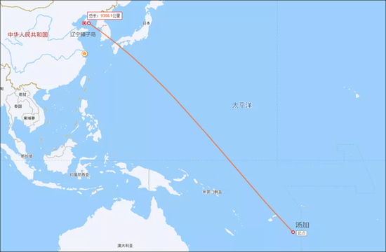 根据地图测距,獐子岛距离汤加直线距离9300公里左右,考虑到中间的陆地阻隔,实际的水域距离可能达到1万公里左右。